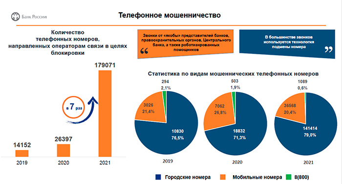 В 2021 году наблюдался рост хищений в денежном выражении практически на 39%, в количественном — на 34%. Основными инструментами злоумышленников были методы социальной инженерии. Несмотря на снижение доли таких операций, они наносят наибольший ущерб гражданам из-за значительной суммы похищенного. В инструментарии злоумышленников лидером является телефонное мошенничество — около 80% общего пула атак. Следующим по популярности каналом атаки стали интернет-ресурсы, на которые граждане заходят самостоятельно — это фишинговые сайты, различные рекламные баннеры, социальные сети.